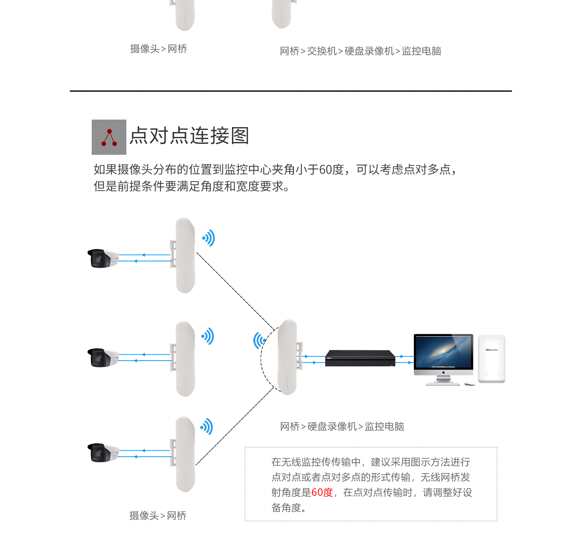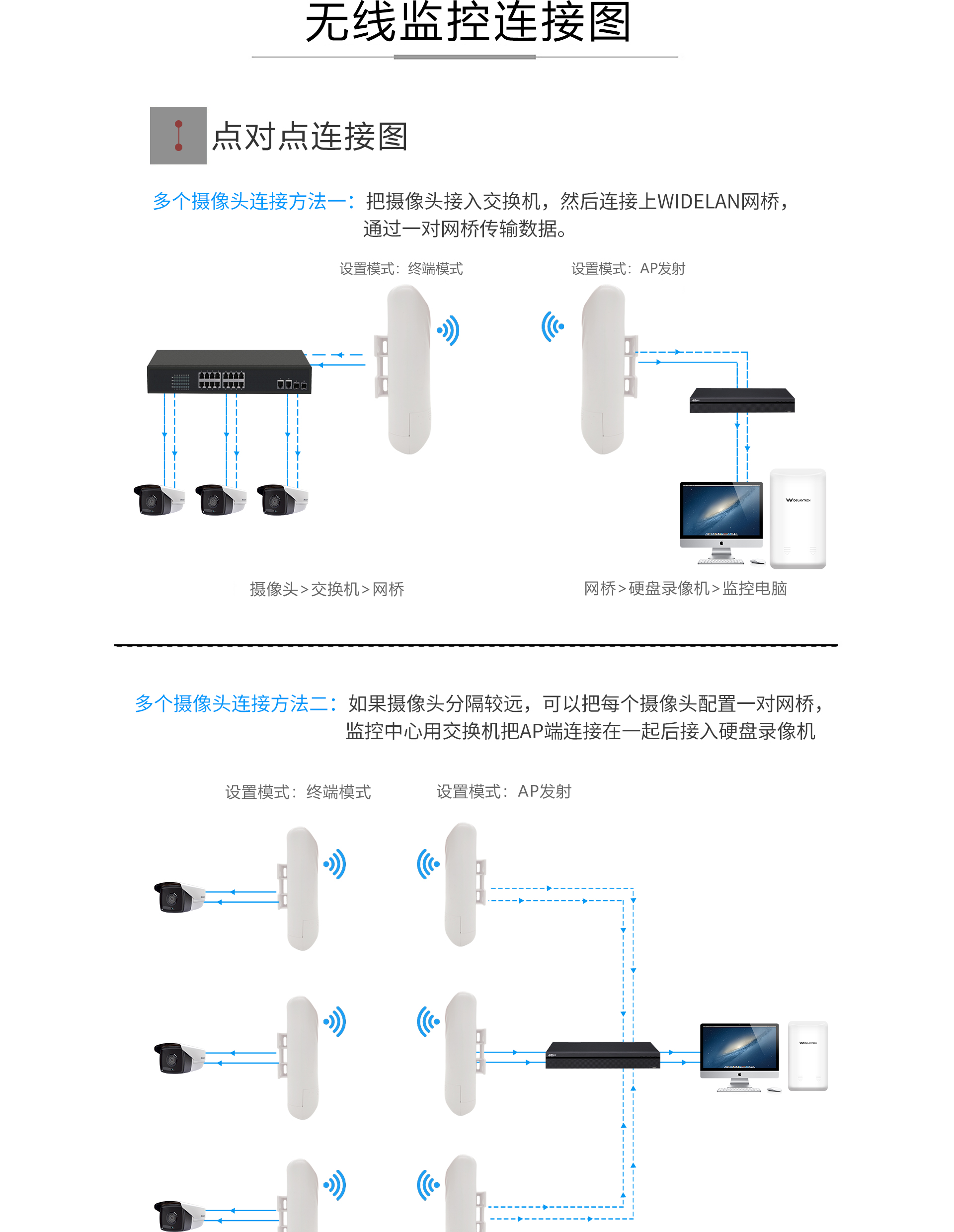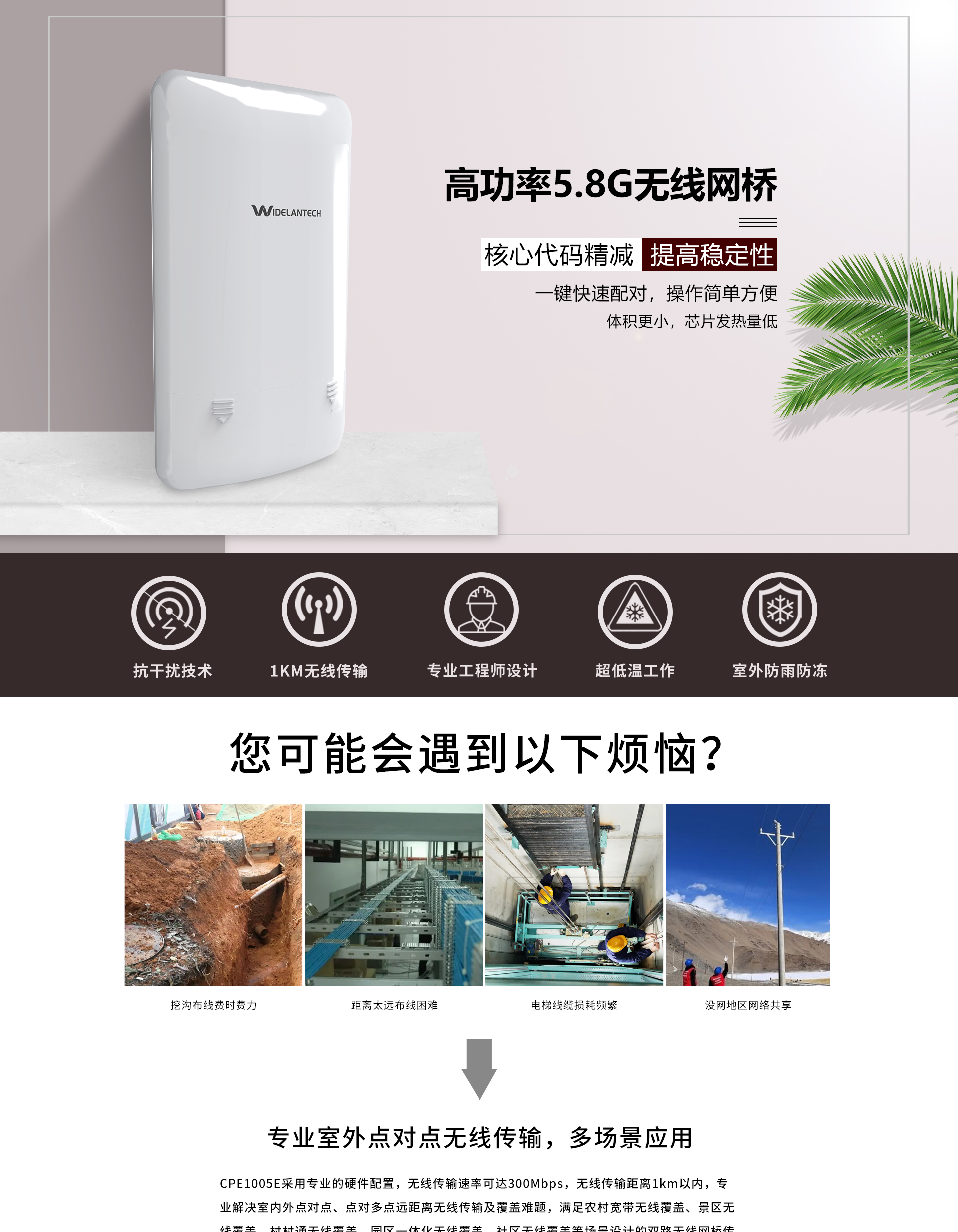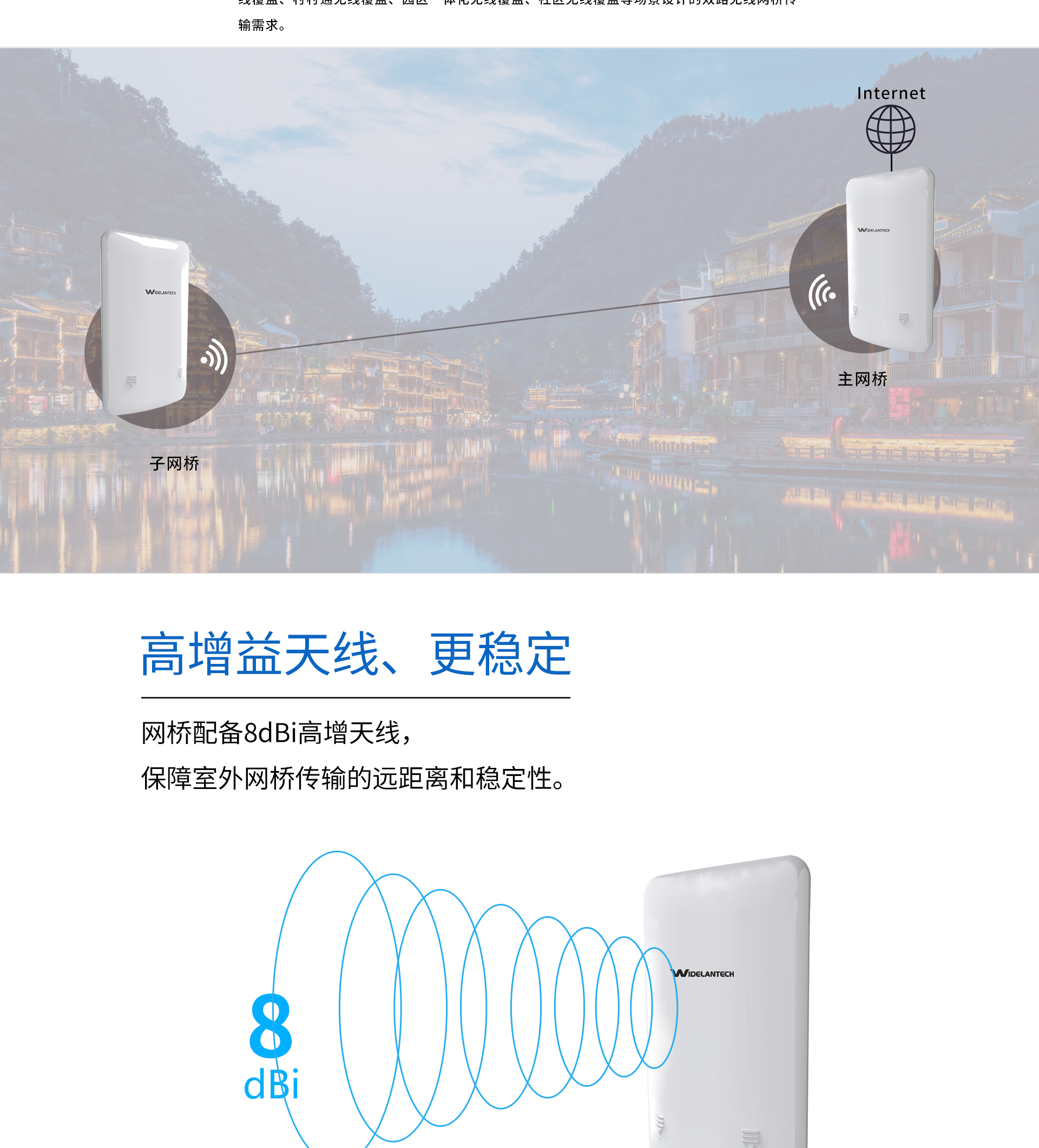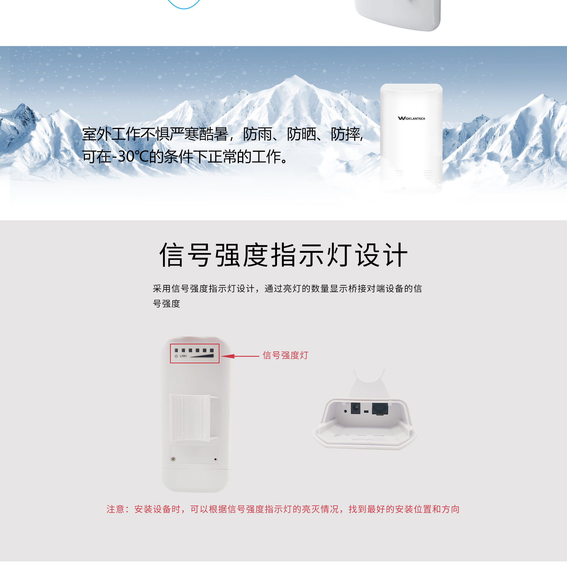 ·专业室外壳体设计,适应各种恶劣环境·WEB管理系统提供丰富的软件功能·支持点对点,点对多点多种连接方式,使用场景更为丰富·内置8dBi定向天线,无线传输距离可达1千米·支持24V Passive PoE供电,无需外接电源·抱杆/壁挂安装,维护简便