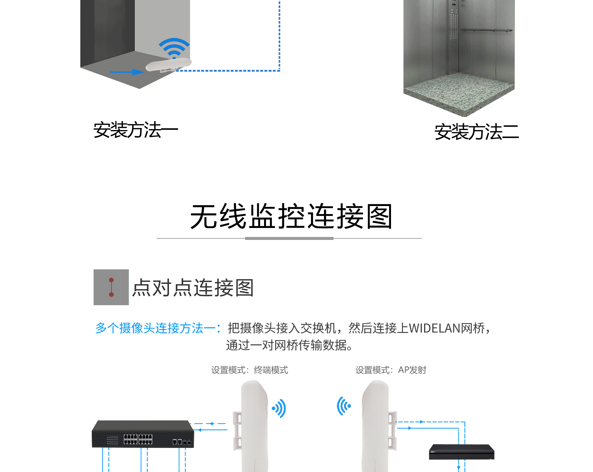 ·专业室外壳体设计,适应各种恶劣环境·WEB管理系统提供丰富的软件功能·支持点对点、点对多点多种连接方式,使用场景更为丰富·内置8dBi定向天线,无线传输距离可达1千米·支持24V Passive PoE供电,无需外接电源·抱杆/壁挂安装,维护简便