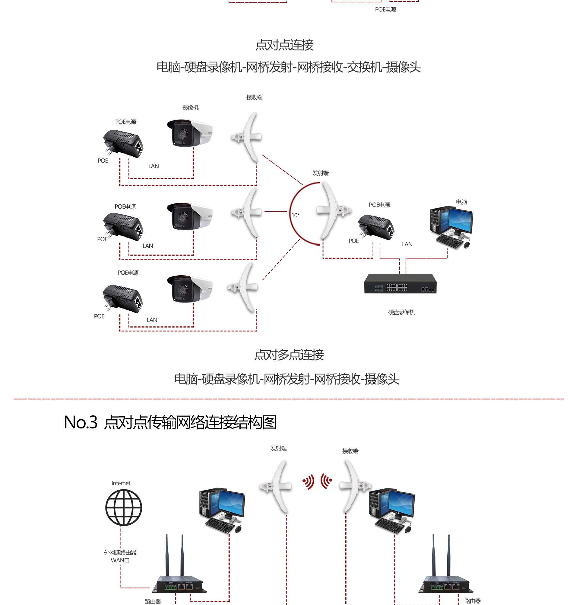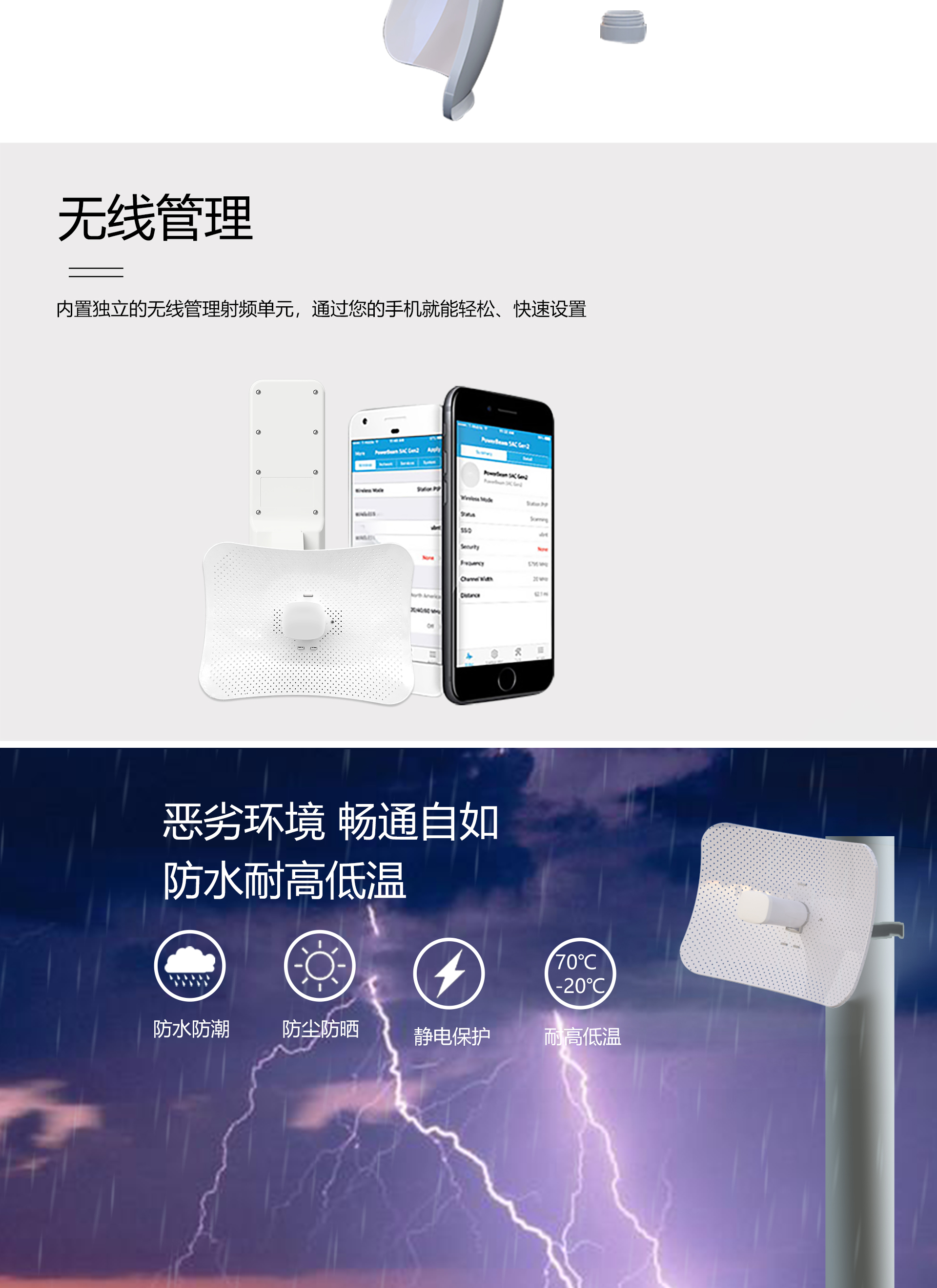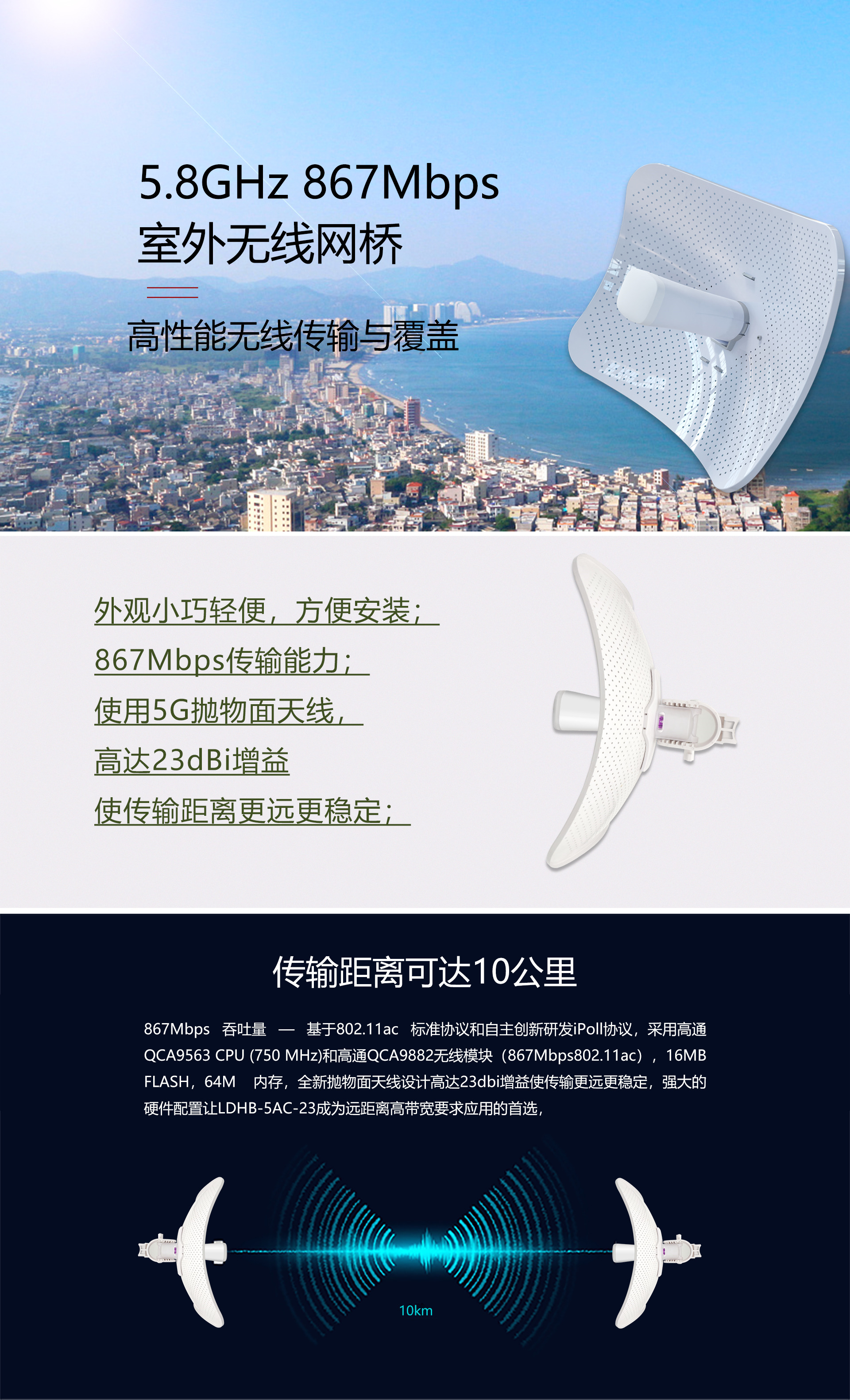 ·专业室外壳体设计,适应各种恶劣环境·WEB管理系统提供丰富的软件功能·支持点对点,点对多点多种连接方式,使用场景更为丰富·外置23dBi高增益天线,无线传输距离高达10千米·支持24V Passive PoE供电,无需外接电源·抱杆/壁挂安装,维护简便
