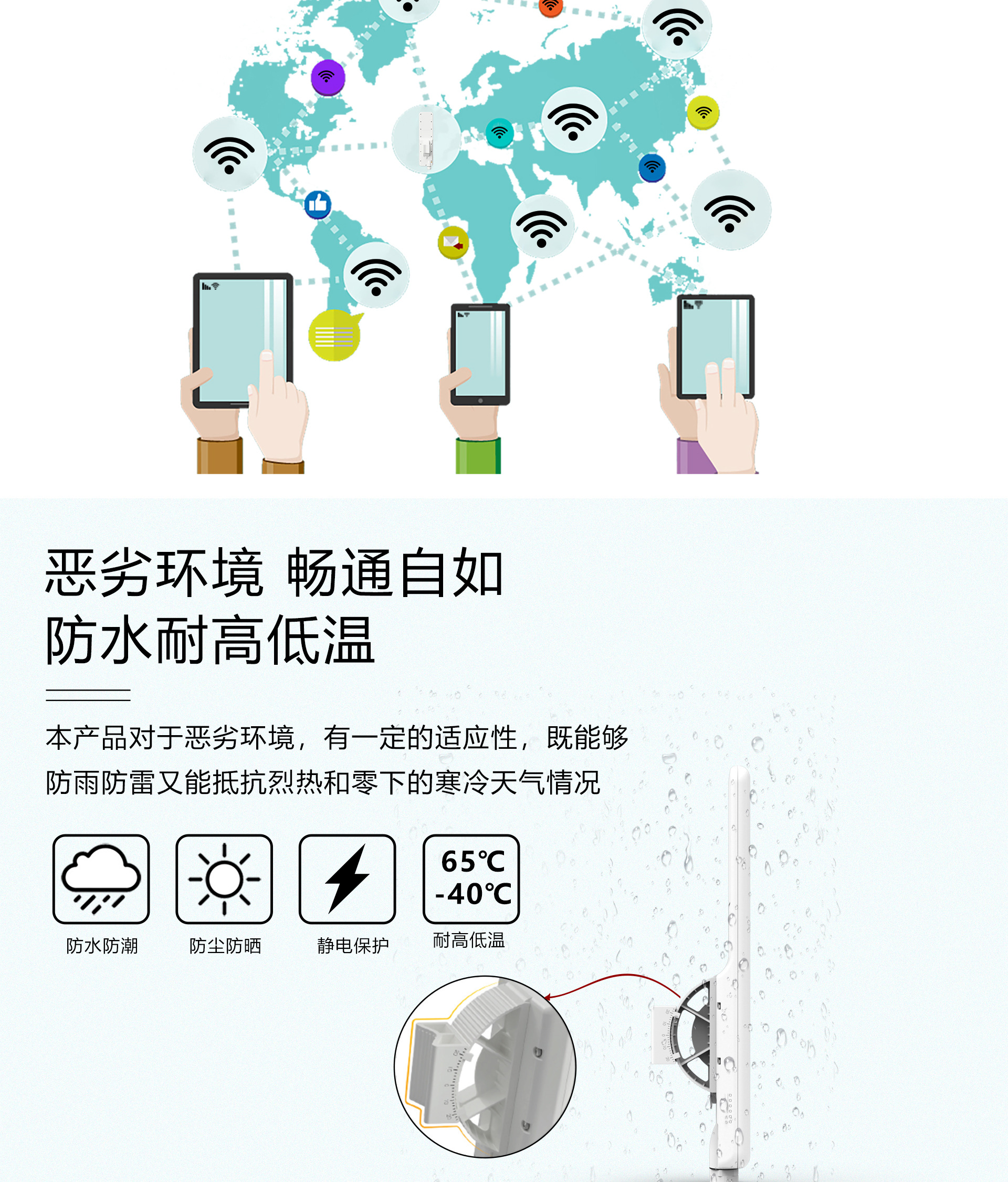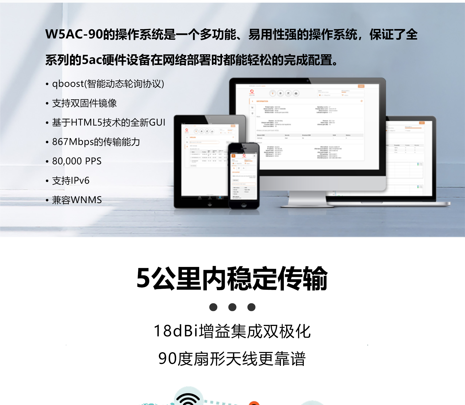 专业室外壳体设计,适应各种恶劣环境,采用高性能网络处理器,WEB管理系统提供丰富的软件功能,支持点对点,点对多点多种连接方式,使用场景更为丰富,外置18dBi高增益天线,无线传输距离高达5千米,支持24V Passive PoE供电,无需外接电源,抱杆/壁挂安装,维护简便。