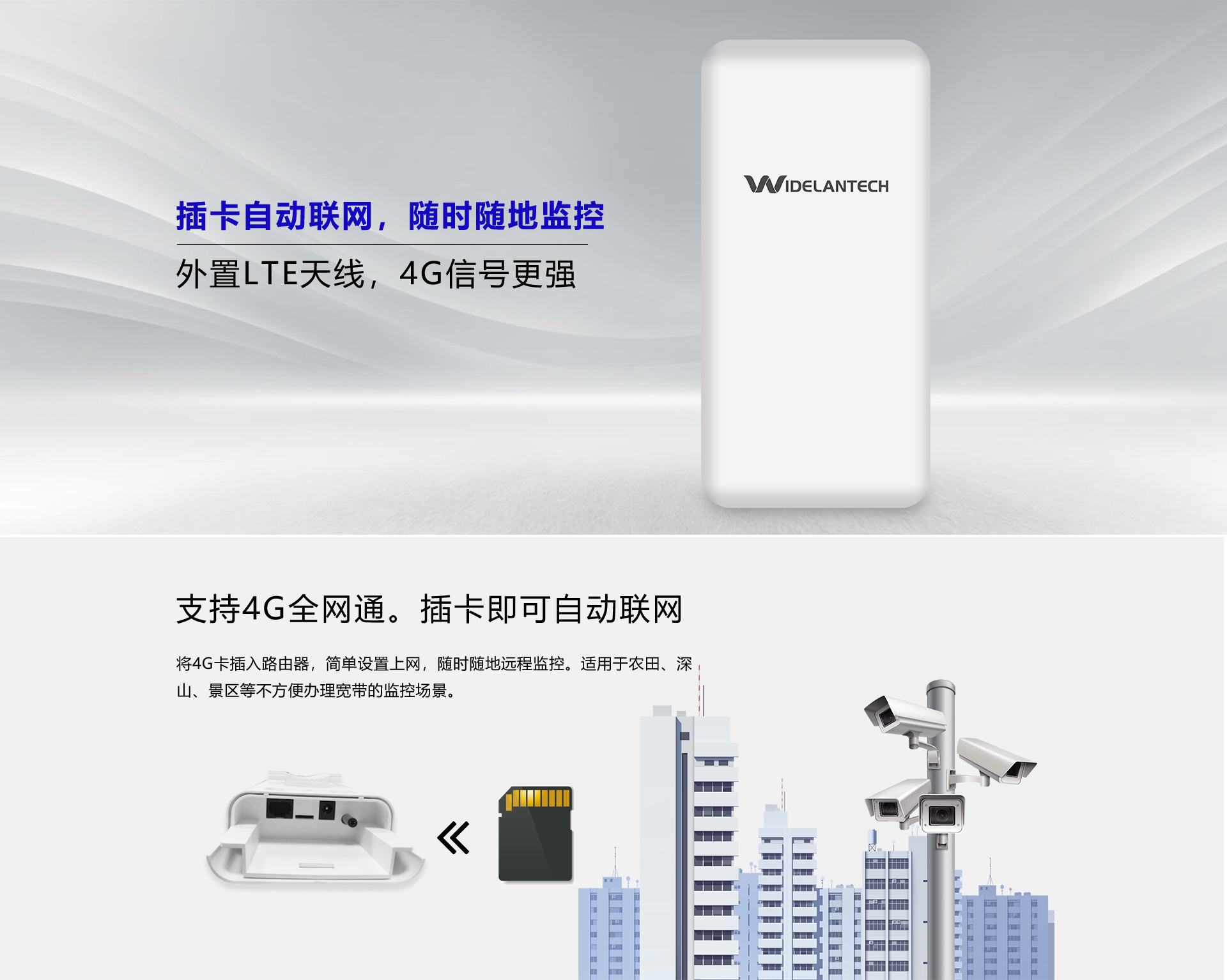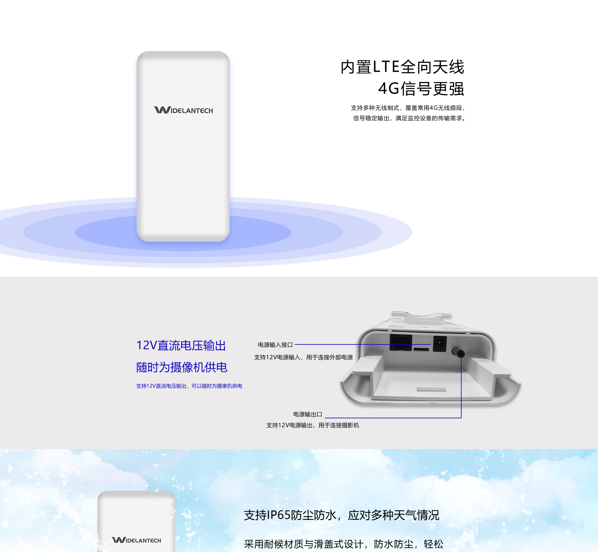 ●插卡自动联网,随时随地监控●外置LTE天线,4G信号更强●支持12VDC电源输出,随时为摄像机供电●支持4G全网通,最高50Mbps上行速率,最高150Mbps下行速率●支持IP65防尘防水,应对多种天气情况