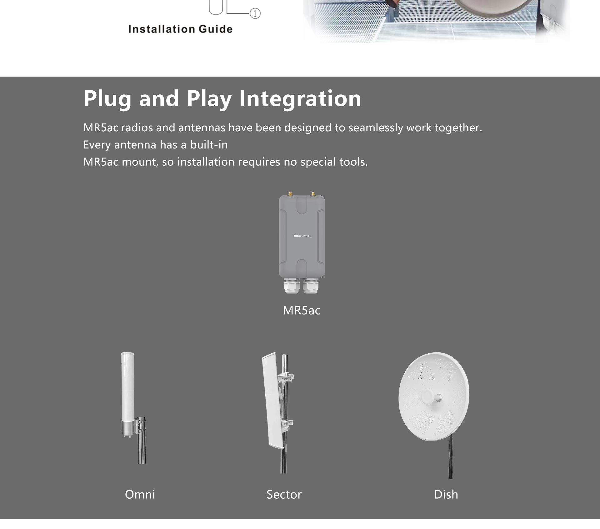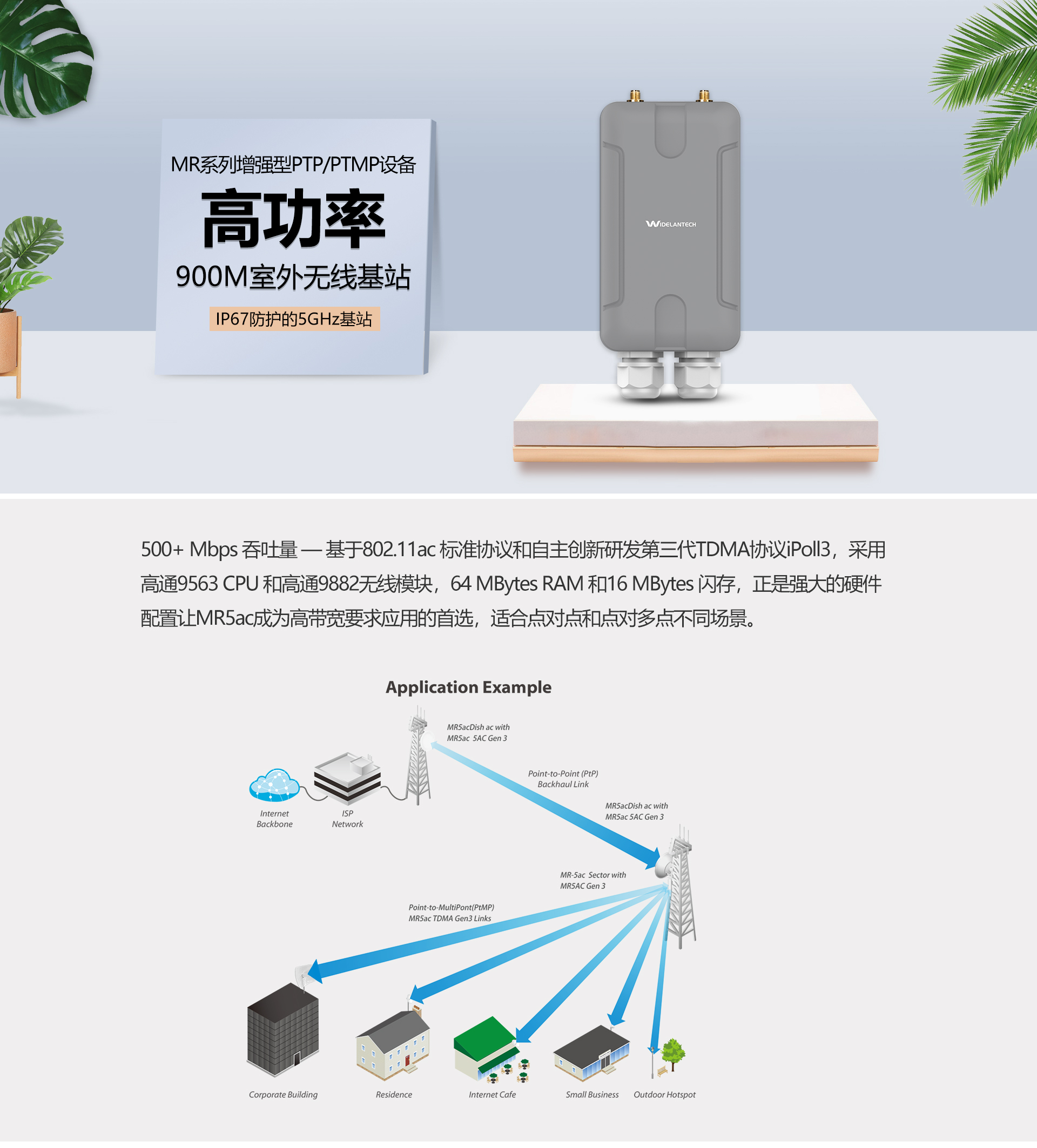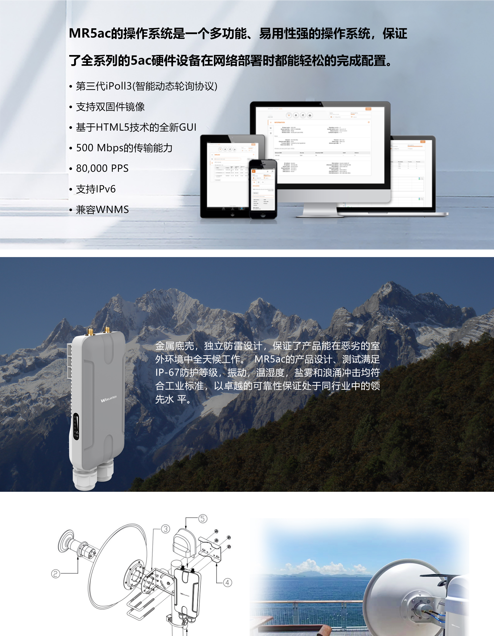 专业室外壳体设计,适应各种恶劣环境,基于802.11ac 标准协议和自主创新研发iPoll协议,采用高通9563 CPU 和高通9882无线模块,64 MBytes RAM 和16 MBytes 闪存,正是强大的硬件配置让MR5ac成为高带宽要求应用的首选,支持点对点,点对多点多种连接方式,使用场景更为丰富,无线传输距离高达30千米,支持24V DC PoE供电,无需外接电源,抱杆/壁挂安装,维护简便。