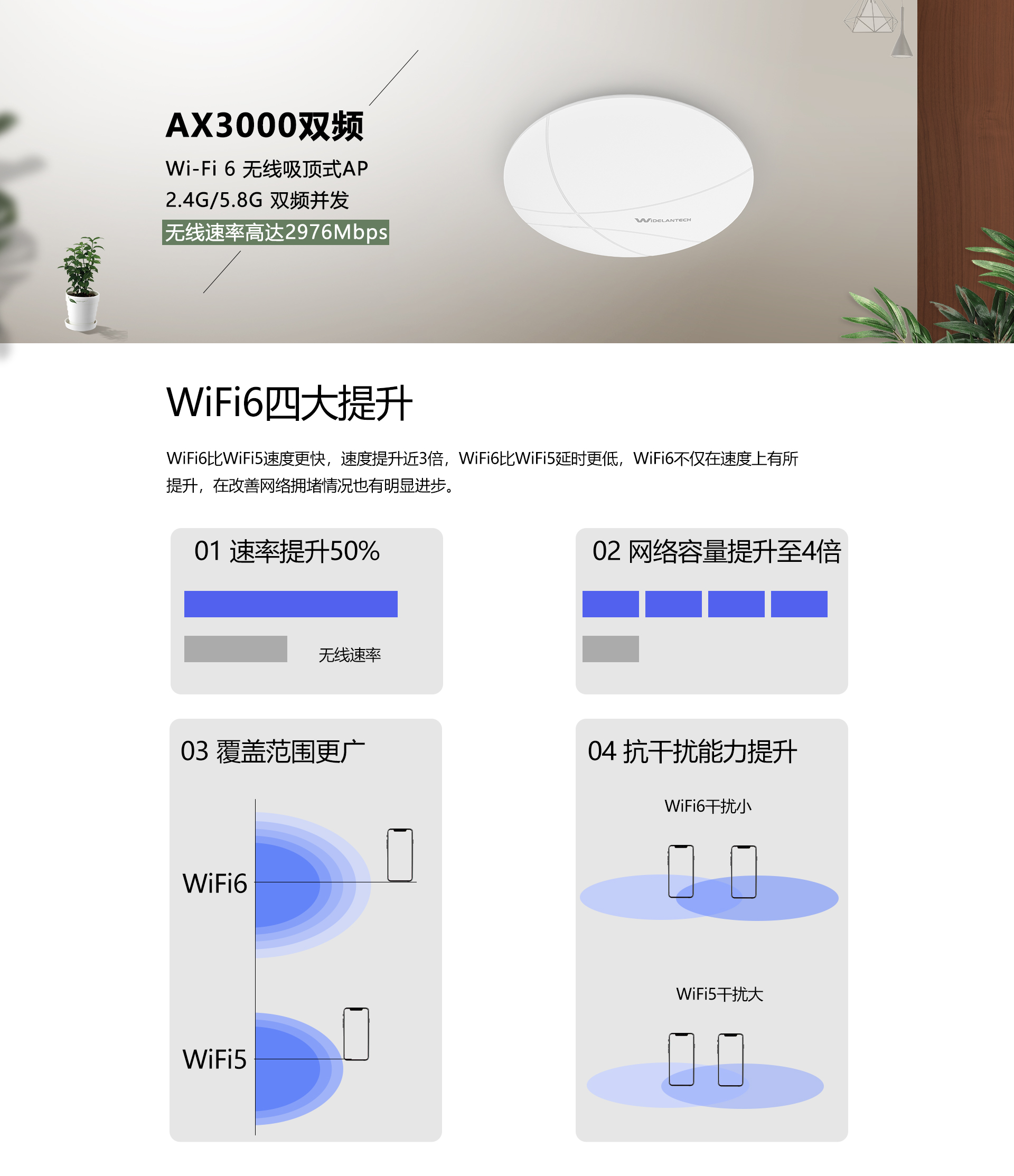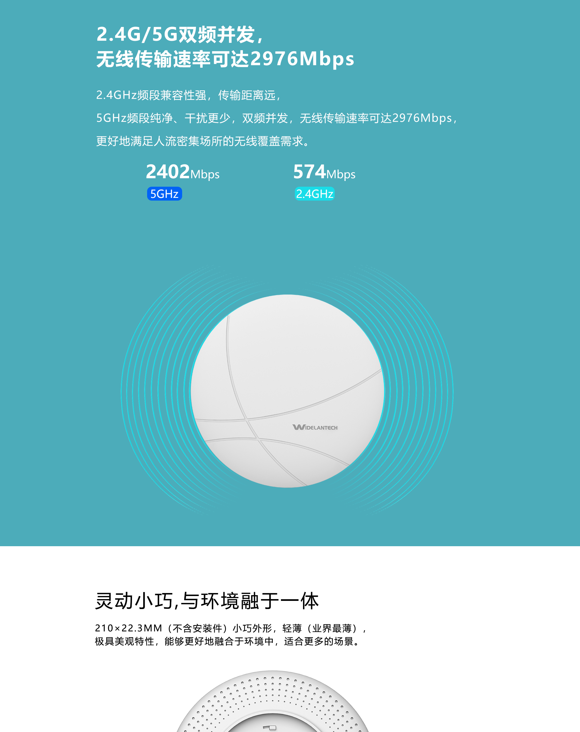 .新一代 Wi-Fi 6 (802.11ax)技术.11AX 2.4G/5.8G 双频并发,无线速率高达2976Mbps. 采用高性能ARM四核CPU.无线发射功率线性可调,根据需求调整信号覆盖范围.简易吸顶式安装,802.3at标准PoE网线供电薄款设计,极具美观特性.支持OFDMA技术,使的多设备可以同时通信,从而提升效率和降低时延.实现多终端同时通信,突破无线传统竞争弊端.支持智能负载均衡.支持硬件看门狗,保障系统的可靠性